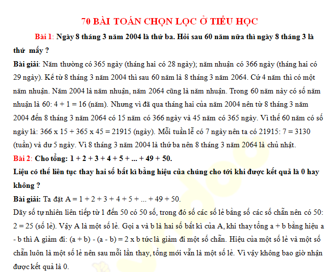 Tổng hợp 70 bài toán tiểu học chọn lọc File tài liệu được tổng hợp 70 bài toán tiểu học hay dành cho các em học sinh Bố mẹ in ra và làm cùng bé nhé. Link tải về: TẠI ĐÂY Nguồn: Vndoc Tham khảo thêm nhiều tài liệu tại: https://butluyenchudep.vn/